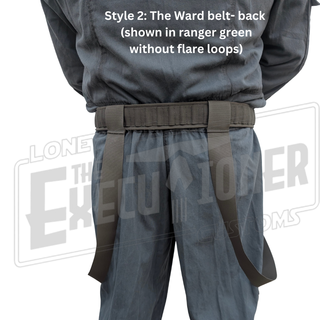 Style 2: The Ward. Adding to the main belt from Style 1, this style adds crash webbing inspired by Colonel Ward (this is not guaranteed to be screen accurate to that character, but is inspired by.) The crash webbing is made out of 2" wide plain webbing. Features 2 additional roller-pin buckles on the front with pull tabs.